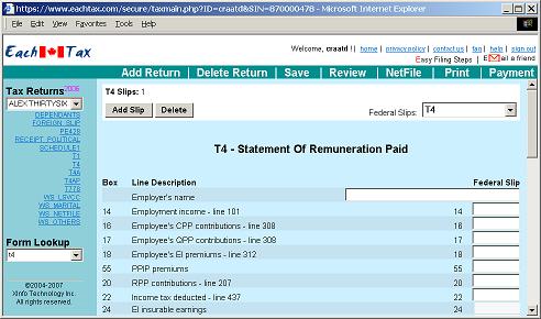 Use " Form Lookup" dropdown list to find the tax slips (e.g., T4, T5, ...) or receipts (e.g., RRSP, ...) and fill in the numbers as shown on the tax slips or receipts that you have collected. AutoFillreturn is available for tax slips.